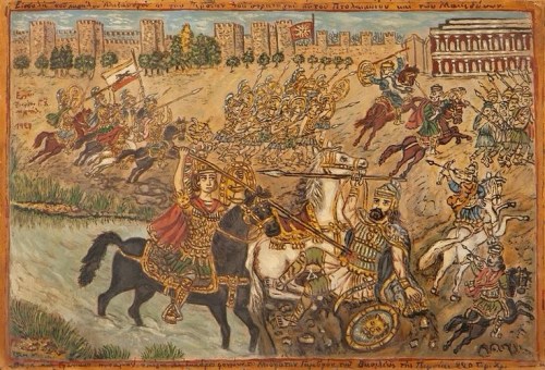 Theophilos Hatzimihail (1870-1934) was a folk artist whose work more than makes up in drama what it lacks in sophistication. Hatzimihail created this piece, which is a portrayal of the Battle of the Granicus River, in 1927. Full of action and drama it is a very raw but well thought out illustration.