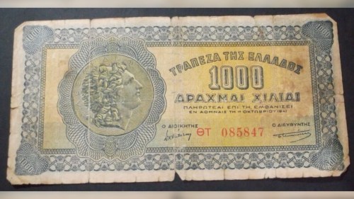 This Greek 1,000 drachma bank note went into circulation in 1941. Just as in the idealistic portrayals from antiquity, Alexander gazes into the distance, here with his head slightly tilted upwards. As Malcolm and Frances note, this image of Alexander is not the divine Alexander: he lacks his ram’s horns and larger-than-normal eyes – perhaps a nod, as Malcolm says, to Christianised Greece.