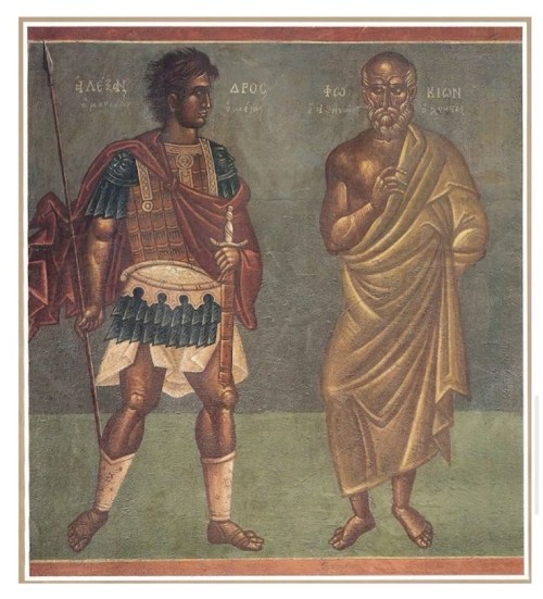 This art work is by Photis Kontoglou (1895-1965). While the art style is Byzantine, Alexander’s head surely owes its origin to the Alexander Mosaic. The man on the right is a Greek statesman named Phocion. The art work can be found in Athens’ City Hall and is part of a much larger work that wraps around all four walls of the Municipal Council Chair’s office.