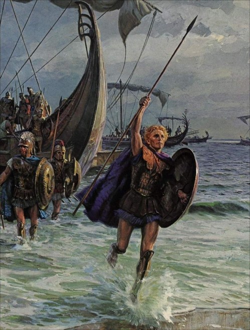 Finally, here is Tom Lovell’s portrayal of Alexander running ashore in Asia Minor. In a few seconds time, he will throw his spear into the sand and claim the Persian Empire as his spear-won territory. It is a very heroic moment, intriguingly undermined, however, by Alexander’s pinched appearance, which gives his face a skull like look.