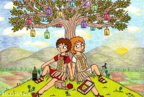 This illustration by BuckyBumble is a particular favourite of Malcolm’s as it combines Alexander with one of his most favourite books, Brideshead Revisited. Early on in their friendship, during the halcyon days of their youth at Oxford, Sebastian Flyte takes Charles Ryder for a drive. It is a beautiful day, and they stop by the roadside for a picnic. This is, Sebastian says, “Just the place to bury a crock of gold… I should like to bury something precious in every place where I’ve been happy and then, when I was old and ugly and miserable, I could come back and dig it up and remember.”
